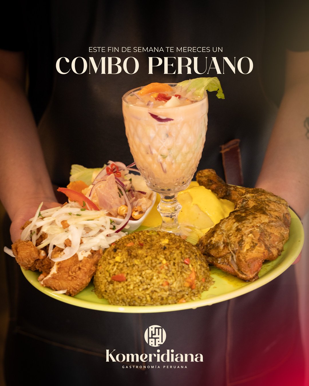 El Combo Peruano es puro festival de sabores: arroz con pollo verde y suave, chicharrón de pescado doradito, papas con huancaína cremosita, ceviche f…